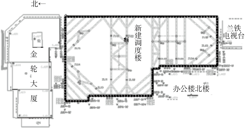 新建兰州局调度楼东侧紧邻和政路,且距和政路主路仅12.80 m,西侧距铁路局办公楼北楼4.15 m,北面距金轮大厦4 m,南面距兰铁电视台4 m(图1)。