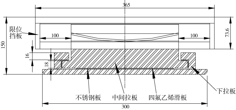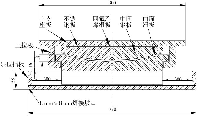 本工程采用双向滑移支座,具有万向转动、万向承载的优点;采用双向抗拉、抗剪的特殊结构,具有能抗地震烈度9度的能力。其支座主要由上支座板、不锈钢板、四氯乙烯滑板、中间钢板、曲面滑板、L形拉板、中间拉板、连接螺栓及下支座板组成。支座上、下均设置单项滑移槽,滑移槽是由L形拉板、不锈钢、四氯乙烯滑板组成的摩擦副,上滑移槽的方向为X向,下滑移槽的方向为Y向,并在X、Y方向的位移限制处设置限位装置。