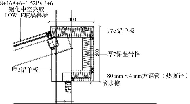 2)采光天窗顶部收边铝板与顶部玻璃幕墙收口处用自攻钉固定后进行打胶处理,保证注胶密封性。收边铝板下口在其最外端设置滴水檐,避免雨水沿铝板底口倒流入室内。
