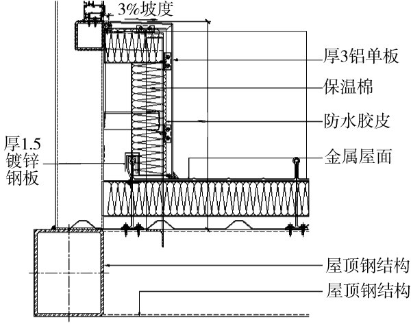 2)开启扇与金属屋面交界部位采用披水板放坡处理,保证排水,避免积水造成的渗漏[3-5]。