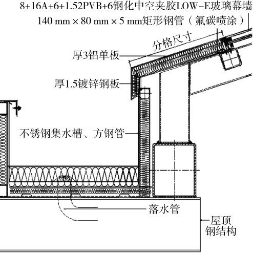 3)竖向底部收口铝单板和采光天窗正立面与金属屋面交界部位为不锈钢天沟,采光天窗背立面与金属屋面交界处为常规金属屋面。