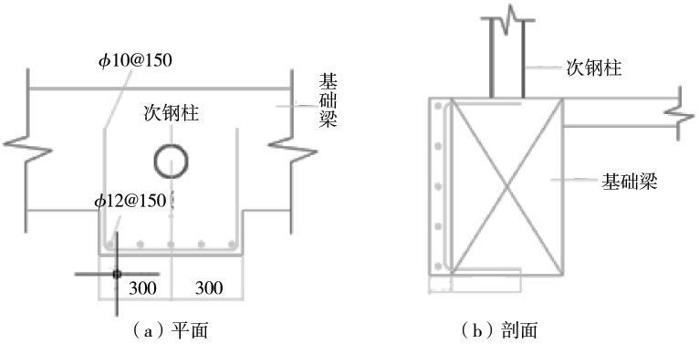 3)次钢结构柱偏心,导致其地脚螺栓位于框架基础梁钢筋保护层处。由于次钢结构柱中心偏离框架基础梁中心线,导致最外侧的地脚螺栓位于框架基础梁钢筋保护层处,没有被钢筋包裹。经与监理、管理公司、设计代表商议,采取梁局部加固措施(图2)。