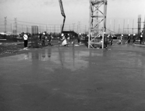 通过现场实测确定,制作1个固定尺寸的试验块(现场将1块30 m×30 m的排架地坪作为试验块),按配合比的混凝土进行浇筑、振捣、初凝、终凝的时间及表面压光的最佳时间的记录,根据每个流水段的工程量来科学、合理指导施工和安排人员、机械。