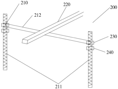 安装时,将2组支撑架结构200整体相互平行地放到楼板的底模上,然后按设计图起始点标高,调整各个螺杆211,拉通线找坡、找直,高度确定后再通过拧紧可调螺母240将两固定杆220的各位置进行固定。