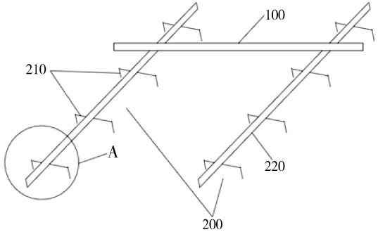 如图3所示,2组支撑架结构200的间距一般在5.50 m左右,以保证刮尺100(长6 m的铝合金)能贴着两固定杆220滑动并将混凝土表面刮平。