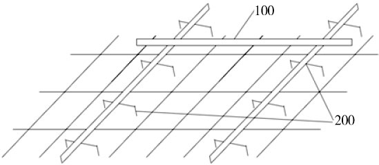 本工程利用的工具式找平系统支撑架结构包括多个支撑脚210和1个固定杆220,固定杆固定在多个支撑脚上方。其中,支撑脚包括2个螺杆和1个横杆,横杆的两端部分别设置有1个固定螺母,螺杆分别对应1个固定螺母进行螺设,螺杆和所述横杆组成1个门形结构,固定杆固定搁置于支撑脚的横杆上(图1)。工具式找平系统将2组如上所述的支撑架结构200进行平行布置,刮尺100搁置于2组支撑架结构200的固定杆220上,并可沿固定杆220滑动。