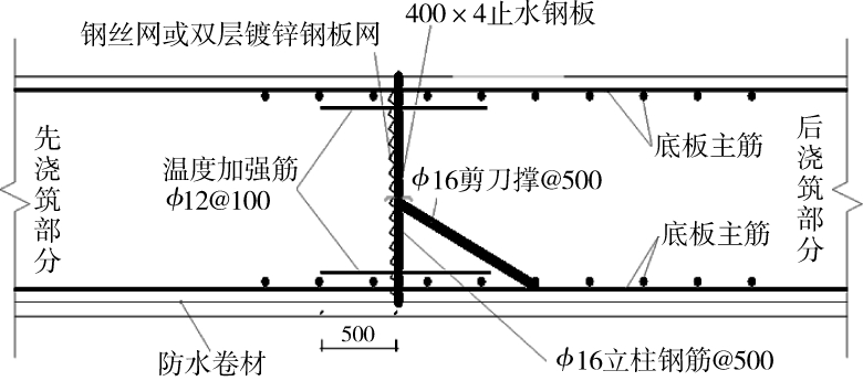 为抵抗分仓缝处温度应力集中与变形,造成此处出现有害裂缝,分仓缝处增设合理的构造配筋,来提高混凝土结构极限拉伸值;在分仓缝处纵向增设50%原设计纵向钢筋,长度伸至施工缝两侧1.20Lae(图2)。