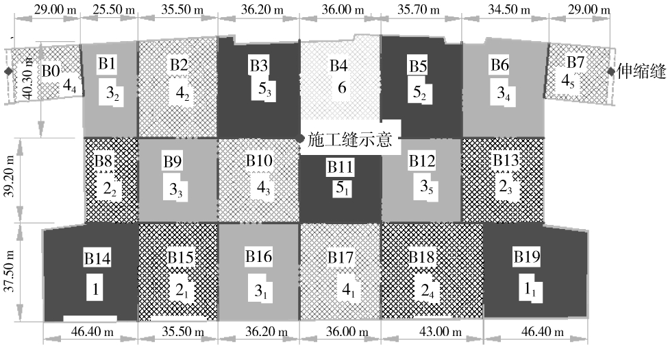 跳仓法的原则为“隔一跳一”,即至少隔一仓块跳仓或封仓施工,分仓缝适当错开。跳仓法施工设计最重要的是跳仓间距的确定,中部分仓块大小不宜大于40 m×40 m, 仓位外侧邻近自由端区域可按略大于40 m设置,跳仓顺序应满足各区互不干扰原则进行跳仓施工。通过理论计算、分析,并结合本工程结构设计,明确了实际仓位大小尺寸,并确定补仓时间间隔不少于7 d,整个B区9 m结构层区域划分为3个施工区域,共计20个仓段,施工期间实际每个仓块尺寸和位置如图1所示。
