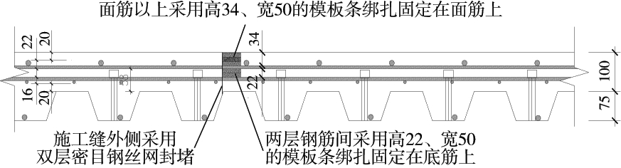 本站房高架候车层的压型钢板与混凝土非组合楼板施工面积较大,我们遂根据图纸后浇带的划分与既有线特点进行分区块、分段施工,在后浇带与区块边(设置在板跨中1/3范围内)均设置施工缝,施工缝采用模板条绑扎固定在钢筋上,施工缝外侧采用双层密目钢丝网封堵(图2)。
