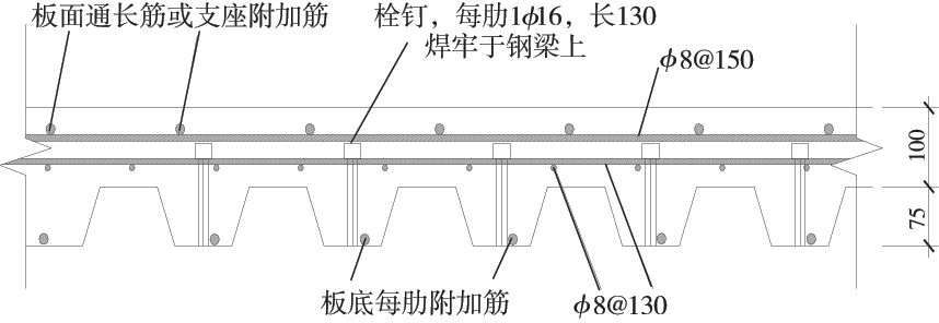 新建高铁杭州东站站房高架层面积为70 000 m2,均采用压型钢板与混凝土非组合楼板。即压型钢板衬底,上铺钢筋混凝土结构楼板,压型钢板采用Q235B热镀锌钢板,板型为YXB75-230-690(T),板材厚1.20 mm。压型钢板上混凝土板厚为100 mm,混凝土强度等级为C35, 混凝土的粗骨料最大粒径不应超过20 mm,混凝土中均掺入聚丙烯增强纤维。压型钢板用抗剪栓钉与钢梁焊接,钢筋混凝土板内设置双层双向钢筋与肋筋,底筋为双向φ8 mm(一级钢),面筋为φ8 mm(一级钢)与φ14 mm(二级钢),板底和板面在支座位置做φ14 mm(二级钢)附加筋(图1)。得材料运输、施工组织难度大,须结合站场转线特点,分段、分区组织施工。