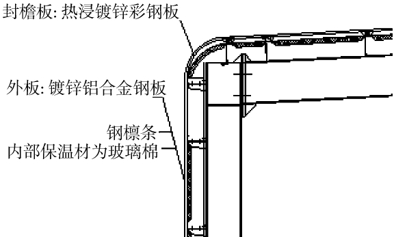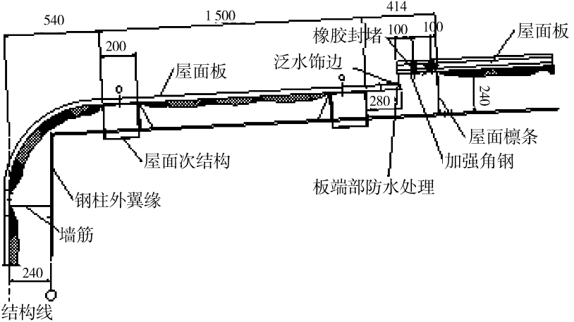 根据设计要求,R角直径确认为1 200 mm。原设计屋面应该与墙面连成一体(图2),才能既确保设计效果,又能满足防水要求。也就是说,屋面的板型必须与墙面板型相配,并且R角圆弧部分必须使用与屋面同样的材质,才能保证此部分荷载及防水的要求。但国内市场上没有现成的材料,经多方查询才找到了一家能生产相类似产品的国内企业。为此,针对这种板材我们进行了专门的节点设计,以满足功能和外观需求。