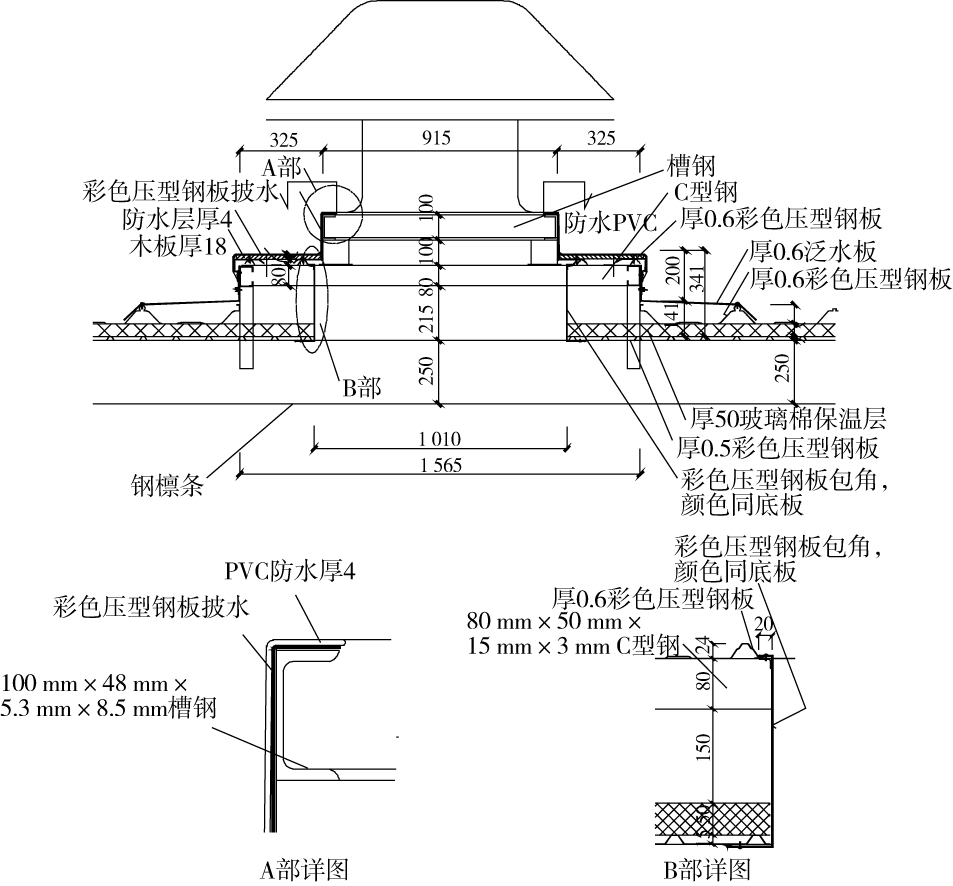 由于屋面进行工厂一体化加工,故可以在开口的背水面底部加工出与屋面板板肋相匹配的凹槽,在安装屋面开口时,只需将该凹槽压在屋面板板肋上,再敷设防水胶后用钉子固定即可做到屋面开口背水面底部的防水;屋面开口的迎水面则采用在该位置设置分水板,使其迎水面无积水区域,分水板与开口完成防水处理,并且从屋面最高处起在迎水面的屋面部分上再盖一层泛水板,宽度与屋面开口完成面相同,防止雨水从屋面板断口及与开口间隙流入建筑物内。最后需要注意的是屋面开口应具备一定的防水高度,整个屋面开口及其附件均直接与屋面板连接固定,而不能与屋面檩条有任何连接点,以确保屋面系统在热胀冷缩过程中不会造成屋面开口处的漏水现象(图6)。