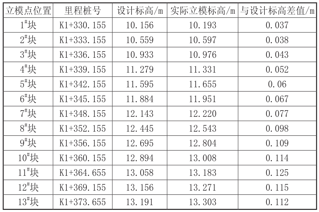 立模点位置 里程桩号 设计标高/m实际立模标高/m与设计标高差值/m 1#块 K1+330.155 10.156 10.193 0.037 2#块 K1+333.155 10.559 10.597 0.038 3#块 K1+336.155 10.933 10.976 0.043 4#块 K1+339.155 11.279 11.331 0.052 5#块 K1+342.155 11.595 11.655 0.06 6#块 K1+345.155 11.884 11.951 0.067 7#块 K1+348.155 12.143 12.220 0.077 8#块 K1+352.155 12.445 12.543 0.098 9#块 K1+356.155 12.695 12.804 0.109 10#块 K1+360.155 12.894 13.008 0.114 11#块 K1+364.655 13.058 13.183 0.125 12#块 K1+369.155 13.156 13.271 0.115 13#块 K1+373.655 13.191 13.303 0.112