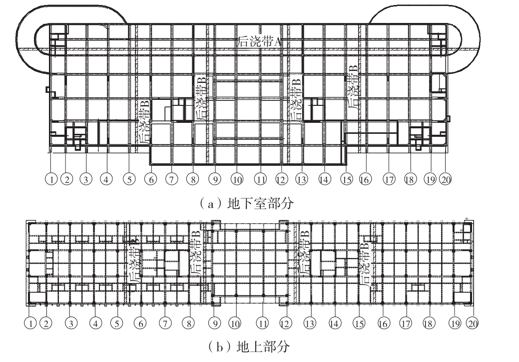 2)在地上结构施工阶段,梁、板的截面尺寸变小,经过与设计沟通,根据图1(b)保留中间2条后浇带,按两大部分