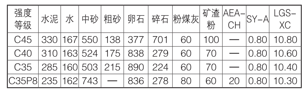 CH SY-A LGSXC C45 330 167 550 138 377 701 60 100—0.80 10.80 C40 310 163 524 175 838 279 60 70—0.80 10.60 C35 285 160 503 215 890 224 60 70—0.80 10.40 C35P8 235 162 743— 836 278 80 60 20 0.80 10.30强度等级 水泥 水 中砂 粗砂 卵石 碎石粉煤灰矿渣粉AEA-