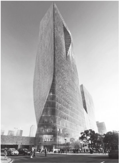 某超高层项目位于广东省深圳市福田中心区,拟建成超高层商业办公楼。工程总用地面积9 047.06 m2,总建筑面积约143 000 m2,其中地上建筑面积107 000 m2,地下建筑面积约为36 000 m2,由南北2栋塔楼、裙楼及4层地下室组成,其中北塔楼42层,高218 m,南塔楼20层,高116 m,裙楼8层,高46 m,工程效果见图1。该工程塔楼采用现浇钢筋混凝土框架-核心筒结构体系,裙楼采用钢结构桁架。