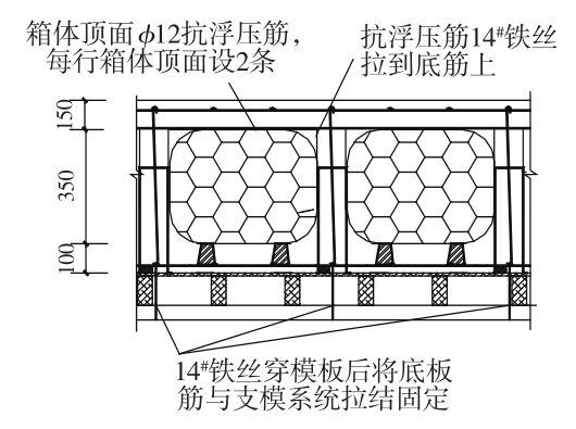 1)设抗浮压筋法(图7):在箱顶面设2条φ12 mm通长抗浮压筋,然后在肋间再用14#铁丝将抗浮压筋与底筋绑紧,间距1 000 mm,底筋与支模体系连接,从而将浮力传递到了支模架上,起到抗浮作用。