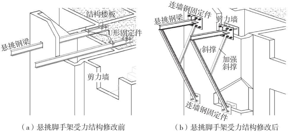 悬挑脚手架受力结构施工部署修改为:原悬挑钢梁悬挑段远端增加斜撑→钢梁悬挑段近端与剪力墙通过连墙固定件进行半刚性连接→钢梁悬挑段远端增设斜拉构件(钢丝绳)→割除电梯井道内侧原悬挑钢梁→电梯井道脚手架搭设→电梯安装工程施工。