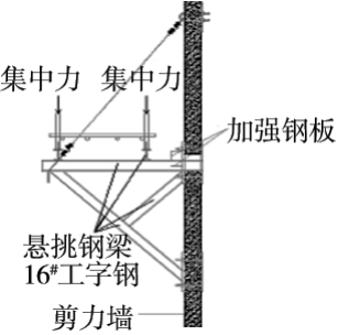 原悬挑钢梁横穿过电梯井道剪力墙及电梯井道内部,与电梯厅部位梁、板预埋件固定,形成稳定的悬臂受力结构体系,却占用了电梯井道的空间,影响电梯安装工程的施工。现采取改变悬挑钢梁支座锚固方式和结构受力形式,使其既满足外脚手架安全使用,又不影响电梯安装工程施工,悬挑脚手架受力结构修改前、后示意如图2所示。