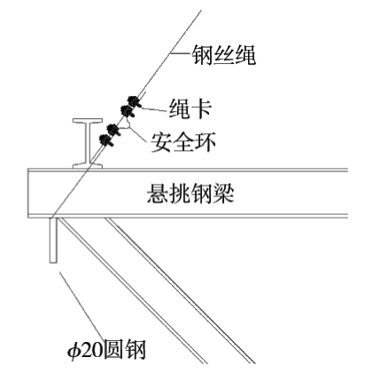 2)钢丝绳与悬挑钢梁锚固节点:在悬挑钢梁下部焊接φ20 mm圆钢短钢筋头,防止钢丝绳向内侧滑动,钢丝绳采用相应绳卡锚固(图7)[4-6]。