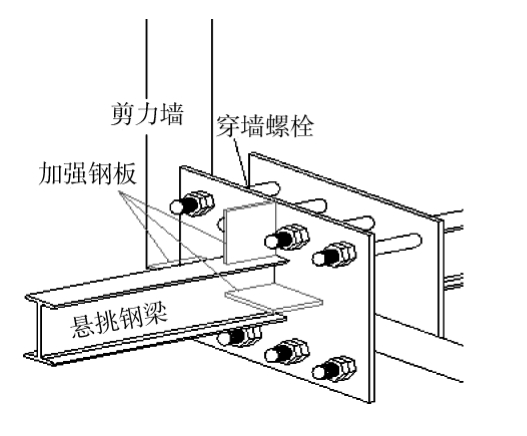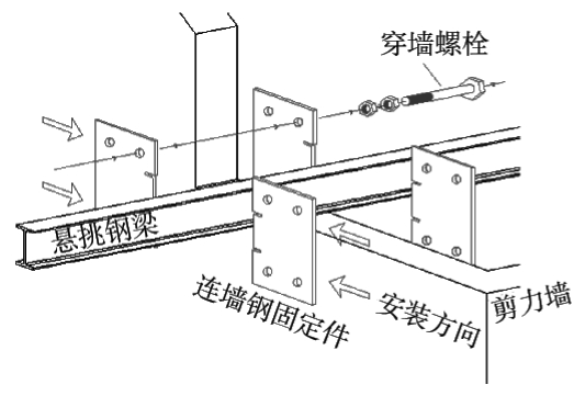 1)悬挑钢梁支座处连墙固定件:4块钢板对称放置于悬挑钢梁和剪力墙两侧,通过预开设的孔洞用穿墙螺栓群相互固定,剪力墙两侧连墙固定件与悬挑钢梁采用满焊连接(图4);