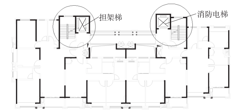 上海嘉定大名城住宅项目位于上海市嘉定区安亭镇秦安路以东、曹安公路以北,总占地面积38 819 m2,总建筑面积约111 188 m2,由1栋20层高层住宅楼、7栋23~26层高层住宅楼、3栋1层商业楼、1层地下车库及附属设施组成。本工程为框架-剪力墙结构高层建筑,电梯井道及楼梯间位于楼层平面一侧(图1)。