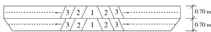 因盖梁长度较长(L=43.96 m),且浇筑厚度为1.40 m,为改善混凝土内部的散热,拟采用分层、分块斜面对称浇筑(图3),这也是为了确保支架在施工过程中均衡受载而采取的由中部向两边扩展的浇筑方式。同时混凝土的振捣也要适应分层、分块斜面浇筑工艺,应在每个斜面层的上、下各布置1道振动器。上面的1道布置在混凝土卸料处,保证上部混凝土捣实,下面1道布置在近坡脚处,确保下部混凝土密实。并且为使上下层成为整体,避免形成接缝,浇筑上层时插入式振动器应伸入到下层一定深度(50~100 mm),同时下层混凝土仍需保持一定塑性,因此须在下层混凝土初凝(8 h)以前浇完上层混凝土。这在客观上也是对浇筑后的下层混凝土进行二次振捣,排出混凝土因泌水在粗骨料、水平钢筋下部生成的水分和空气,提高混凝土与钢筋的握裹力,防止因混凝土沉降而出现的裂缝,减少内部微裂,增加混凝土密实度,使混凝土的抗压强度提高10%~20%,从而提高抗裂性、减少混凝土收缩、提高混凝土的极限拉伸值,这对防止产生伸缩裂缝亦起了一定的作用。对每一振动部位,必须振动到该部位混凝土密实为止。密实标志是混凝土停止下沉,不再冒出气泡,表面平坦、泛浆。随着混凝土浇筑的向前推进,振动器也相应跟上。因此长盖梁泵送混凝土的表面水泥浆较厚,在浇筑后要进行处理。即先初步按设计标高用长标尺刮平,然后在初凝前用铁滚筒碾压数遍,再用木蟹打磨压实,以闭合伸缩裂缝。泵送混凝土囿于地形条件限制,需用橄榄车配合自动搅拌车进行施工。综合考虑人力、机械、现场自然条件等因素,分层、分块斜面浇筑宜考虑掺加有缓凝效果的减水剂,如前所述,掺加占水泥质量1.50%的早强高效减水剂。经初步测算,此长盖梁浇筑完约需8 h。同时,为减少成品混凝土的表面毛细气孔,混凝土坍落度宜控制在泵送混凝土的低限,即必须小于12 cm,为10 cm±2 cm。浇筑当天气温为16 ~20 ℃,浇筑完的时间也应是一天中气温较低的时间,因此决定该长盖梁在12:00左右开始浇筑,由于准备工作较充分,在19:30时已经顺利结束,实际总的浇筑时间为7.50 h,与施工方案预计的浇筑时间差不多,因此也降低了此长盖梁混凝土的总温升和减少了结构的内外温差,并满足了分层、分块斜面浇筑工艺要求[3,4]。