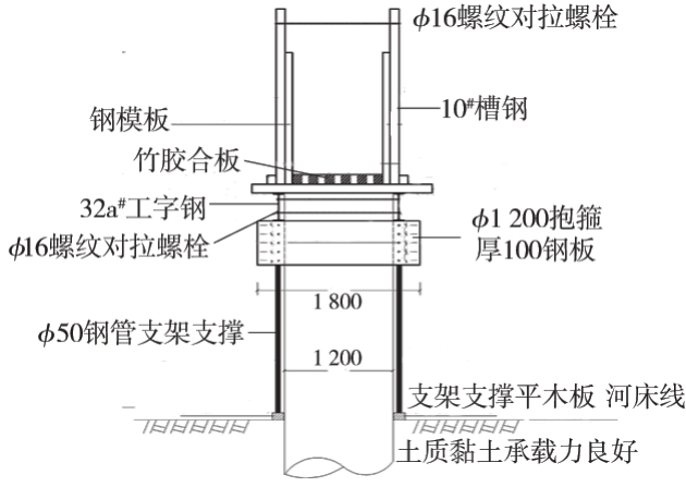 在模板及支架支撑方案的选择中,我们结合伸缩裂缝控制中改善约束条件的要求,首先选择在结构上解除部分外约束以减少因结构变形引起的应力产生的裂缝,因此决定采用与常规施工不同的方法——先施工盖梁后施工横系梁。但是这种施工方法也增大了长盖梁的模板和支撑的难度,而模板和支撑的成功与否又直接影响到长盖梁钢筋混凝土的强度和表观质量,尤其作为桥梁下部结构长期暴露在水面上高湿度环境中,基本要求其形成的混凝土就是清水混凝土,不作任何修饰,即“外光内实”。因此根据施工现场实际情况,本着“安全、经济、实用”的原则,选用抱箍法(加部分钢管支架支撑)来作模板支撑(图2)。