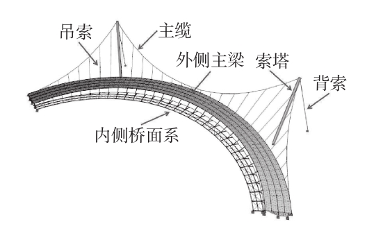 上海国际旅游度假区空间曲梁单边悬索结构体系主要由内外侧主梁、空间主缆、吊索、背索、环索和倾斜的索塔组成,桥两端固结于桥台,跨中由悬挂于主缆上的柔性斜向吊索提供竖向弹性支撑。索塔采用倾斜的钢管(单边),索塔与主墩采用铰接的形式;主缆为空间悬链线布置,位于外侧主梁外侧,每个索塔顶部设置1根背索,背索与主跨、边跨主缆一起,保证成桥时索塔顶部的整体平衡;内、外侧主梁采用铰接加拉杆的形式,并通过设置环向水平拉索来平衡竖向翻转力矩。东桥外侧桥面中心线位于R=46.75 m的圆曲线上,内侧桥面中心线位于R=42.75 m的圆曲线上,总长120 m。桥面采用圆曲面钢梁,分为内侧宽3 m人行道和外侧宽6 m自行车通道,梁高1.70 m。结构如图1所示。