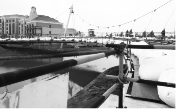 由于受到场地吊装条件的限制,为充分利用抽水方便的条件,故本桥静载试验的加载采用水袋加载的方式,通过水袋中充水多少反映桥面施加荷载的大小。采用水袋加载不仅减少人工搬运工作量,而且提高了荷载布置均匀性,为最大限度地反映设计荷载布置情况创造了条件。