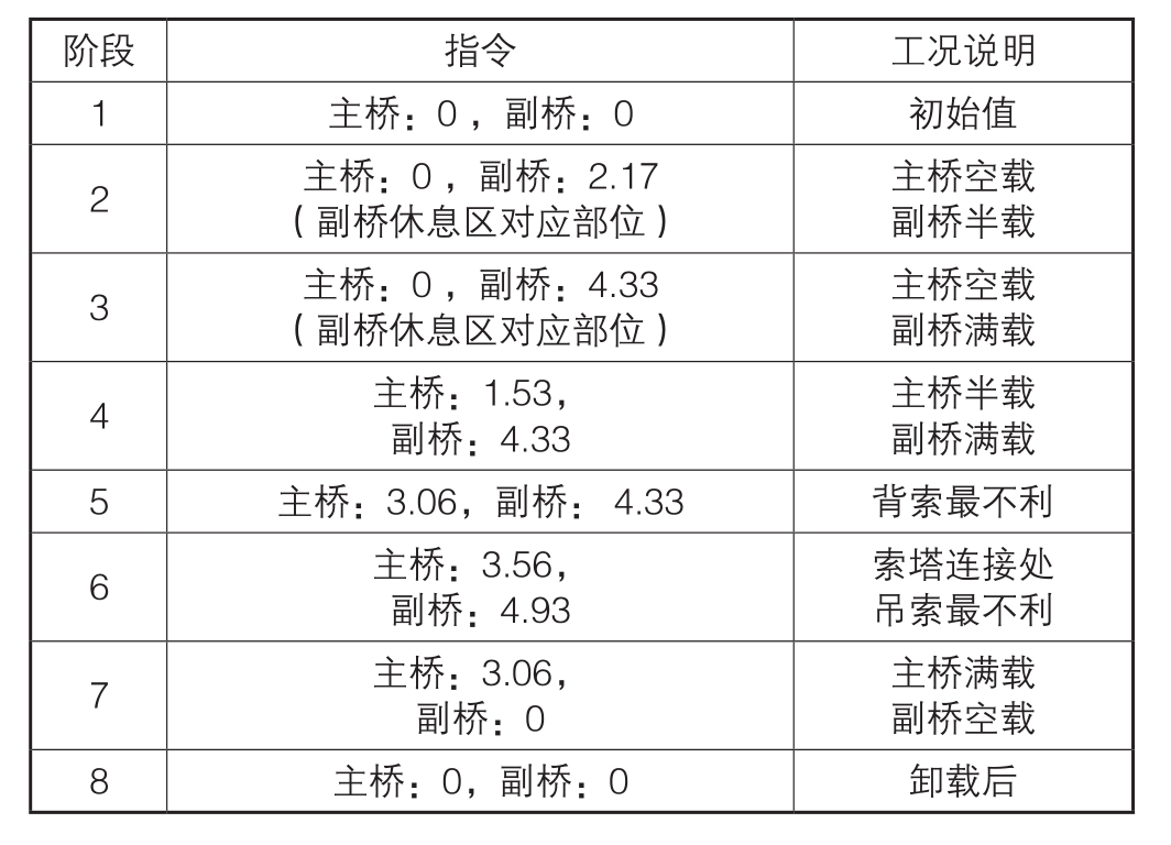 阶段 指令 工况说明1主桥:0 ,副桥:0 初始值主桥空载副桥半载3 2主桥:0 ,副桥:2.17(副桥休息区对应部位)主桥空载副桥满载4主桥:0 ,副桥:4.33(副桥休息区对应部位)主桥半载副桥满载5 主桥:3.06,副桥: 4.33 背索最不利6主桥:1.53,副桥:4.33索塔连接处吊索最不利7主桥:3.56,副桥:4.93主桥满载副桥空载8主桥:0,副桥:0 卸载后主桥:3.06,副桥:0