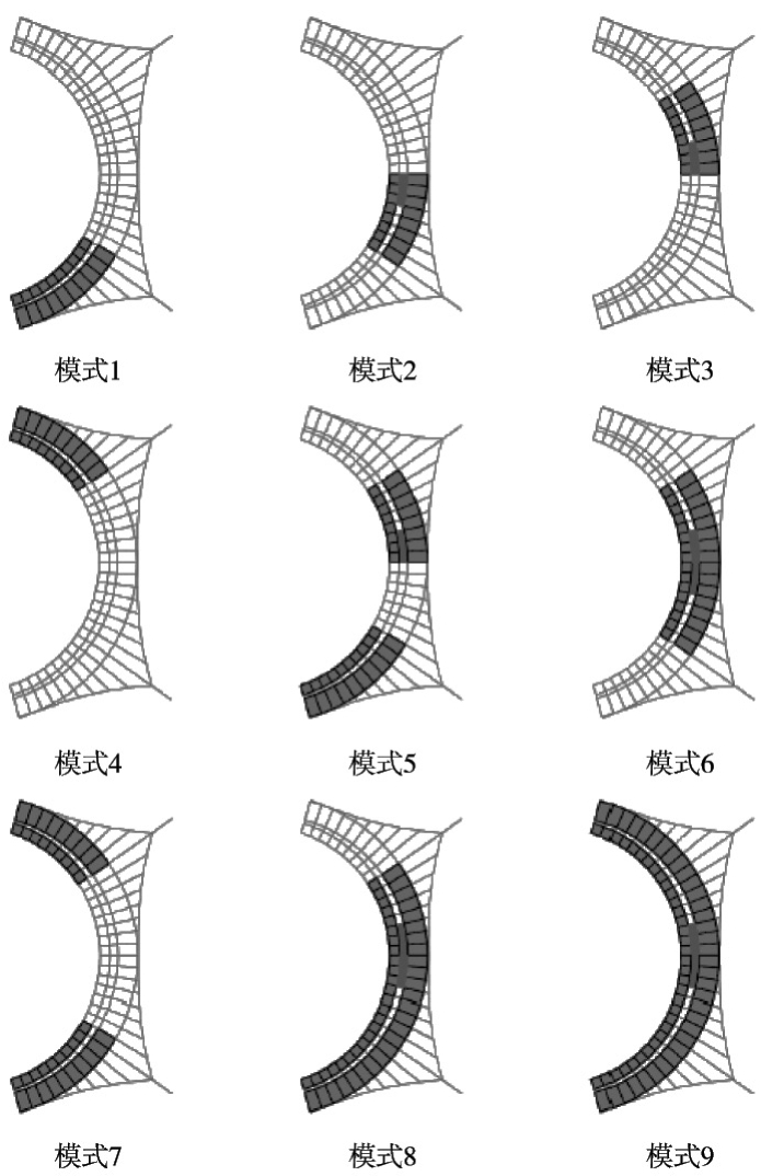 模式1~模式4的设计活荷载,内侧桥板为4.80 kN/m2,外侧桥板为4.30 kN/m2;模式5~模式7的设计活荷载,内侧桥板为4.10 kN/m2,外侧桥板为3.80 kN/m2;模式8的设计活荷载,内侧桥板为3.60 kN/m2,外侧桥板为3.30 kN/m2;模式9的设计活荷载,内侧桥板为3.00 kN/m2,外侧桥板为2.80 kN/m2。