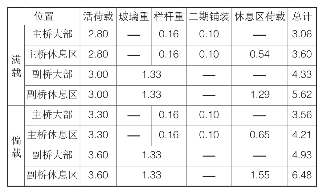 位置 活荷载 玻璃重 栏杆重 二期铺装 休息区荷载 总计满载主桥大部 2.80 — 0.16 0.10 — 3.06主桥休息区 2.80 — 0.16 0.10 0.54 3.60副桥大部 3.00 1.33 — — 4.33副桥休息区 3.00 1.33 — 1.29 5.62偏载主桥大部 3.30 — 0.16 0.10 — 3.56主桥休息区 3.30 — 0.16 0.10 0.65 4.21副桥大部 3.60 1.33 — — 4.93副桥休息区 3.60 1.33 — 1.55 6.48