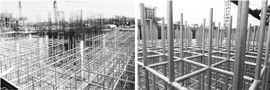 中国移动信息港工程水平结构全部采用承插型键槽式支撑体系,支撑体系配置按地下室2层面积共48 500 m2满配,同时满足到地上结构周转使用的要求[1-2]。