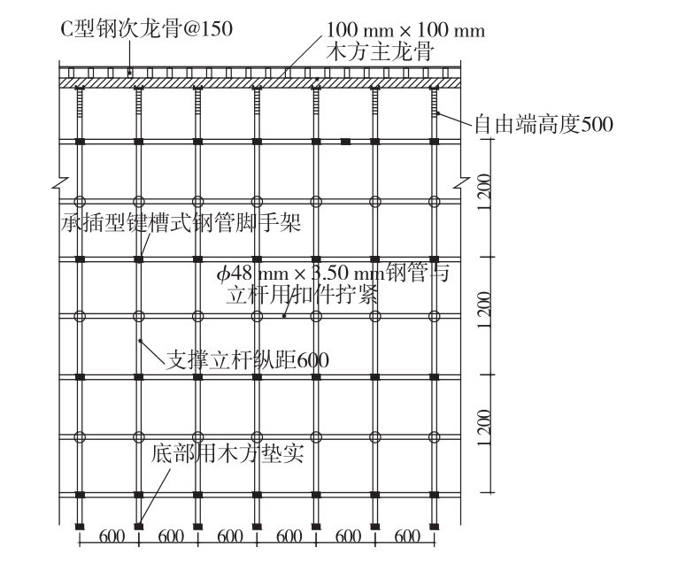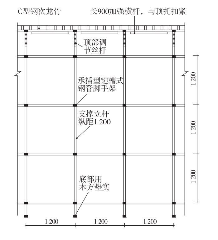7)安装模板体系。根据模板设计参数沿垂直于加强横杆方向放置50 mm×100 mm的C型钢次龙骨,随后铺设多层板并固定[3-5]。