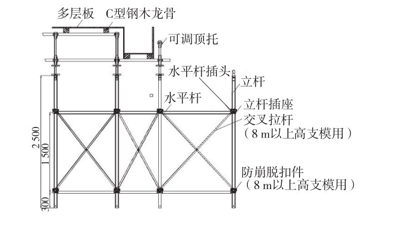 承插型键槽式支撑体系由立杆、水平杆、竖向斜杆和水平斜杆、防崩脱扣件(8 m以上高支模用)、可调顶杆等配件组成,如图1所示。