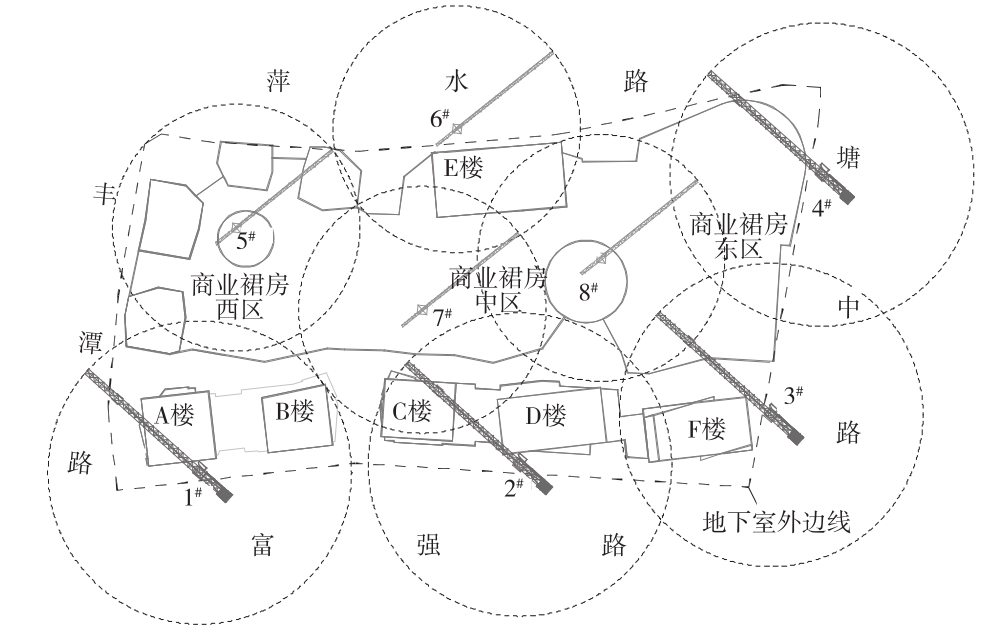 充分考虑以上要求,根据现场实际、施工需要、塔吊的起重性能等因素,经过反复比较和筛选,最终确定了采用4台TC7035B型塔吊和4台ZJ5710型塔吊配合作业,可基本覆盖整个施工作业面。为便于区分和管理,对塔吊进行统一编号,其中4台TC7035B型塔吊分别编号为1#、2#、3#、4#, 4台ZJ5710型塔吊分别编号为5#、6#、7#、8#。其中1#、2#塔吊分别负责A、B楼和C、D楼的施工,3#、4#塔吊分别负责F楼和商业裙房东区的施工,E楼及商业裙房西区、中区等普通钢筋混凝土区域则由5#~8#塔吊负责施工(图1)。