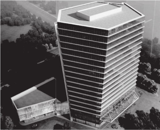 融科智地联想园区B座综合办公楼位于北京市海淀区,是联想控股下联想园区的收官之作。本工程地下4层、地上18层,建筑高度80.00 m,1~3层层高5.00 m,4~17层层高4.10 m,18层层高5.50 m,总建筑面积为96 983 m2,是集餐饮、影院、购物、办公室、会议室及各类机房于一体的高端商务写字楼(图1)。