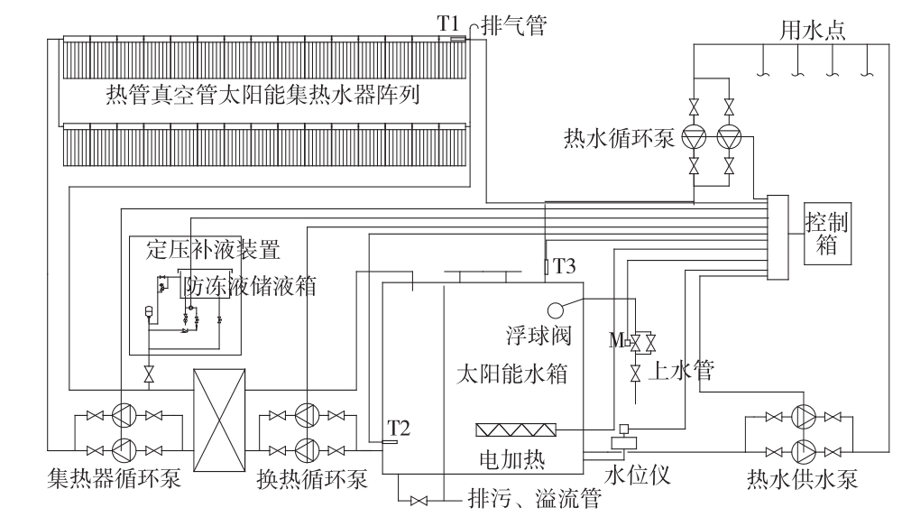 太阳能热水系统利用位于主楼屋面的太阳能集热器阵列将真空集热管内的乙二醇加热,通过集热器循环泵、换热循环泵使得加热后的乙二醇与太阳能水箱中的水进行热交换,将乙二醇的热量传递给太阳能水箱中的水。在热水供水泵和热水循环泵的共同作用下,太阳能生活水箱中的水即可实现各楼层生活热水的正常用水(图3)。